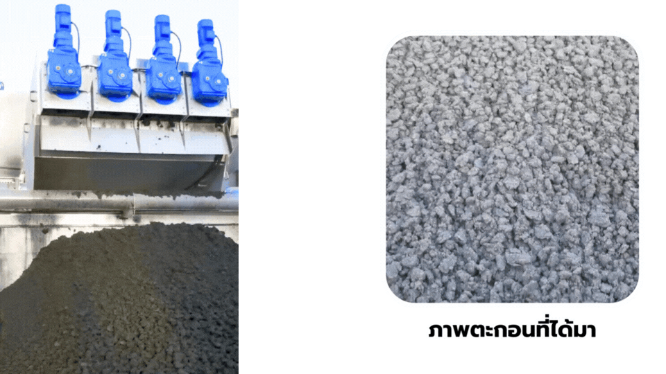 ลักษณะตะกอนที่โดนแยกน้ำออกจากเครื่อง Screw Press