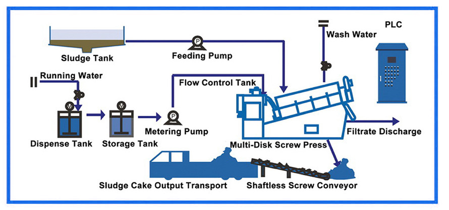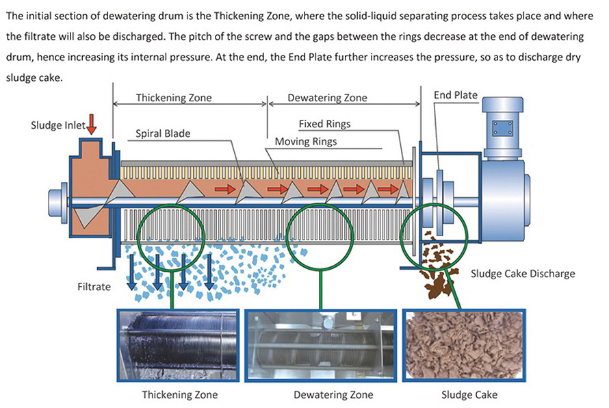 Screw Press ทำงานด้วยสกรู หมุนเพื่อบีบอัดตะกอน และแยกน้ำออกไปได้ง่าย