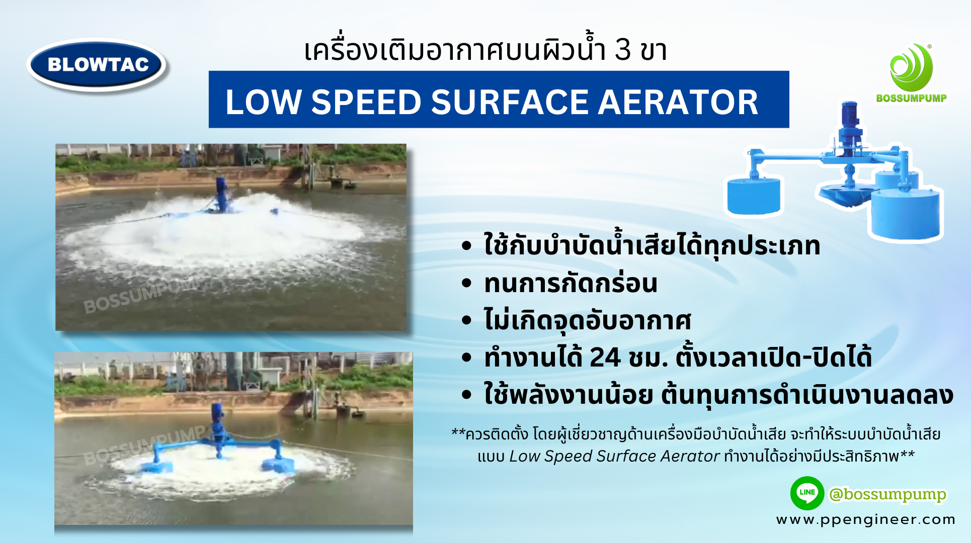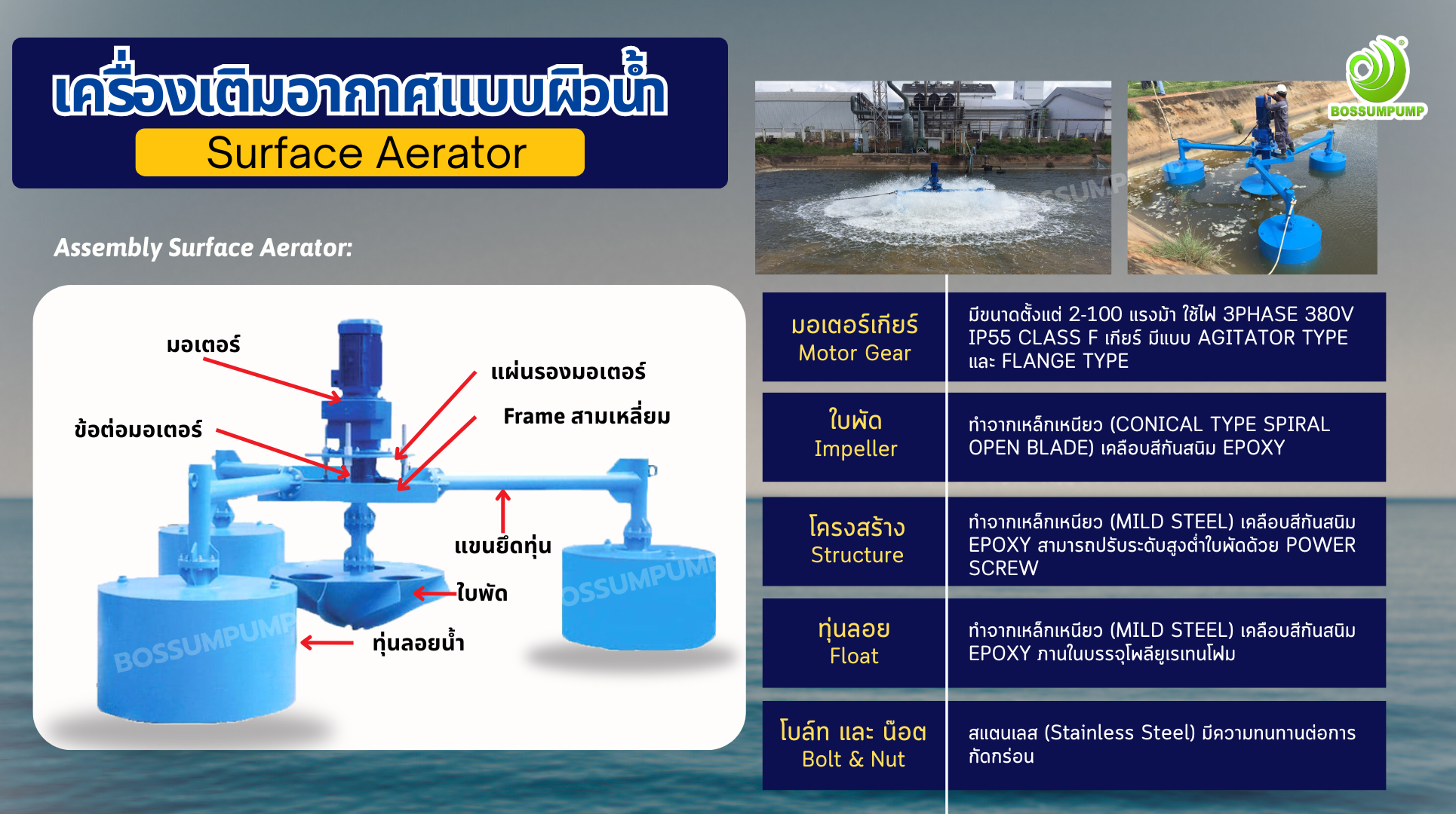 Surface aerator เป็นเครื่องเติมอากาศที่ทำงานบนผิวน้ำ โดยใช้ใบพัดหมุนเพื่อช่วยให้น้ำสัมผัสกับอากาศมากขึ้น วิธีนี้ช่วยเพิ่มออกซิเจนในน้ำได้อย่างรวดเร็ว และยังช่วยลดความสกปรกในน้ำเสียได้อีกด้วย