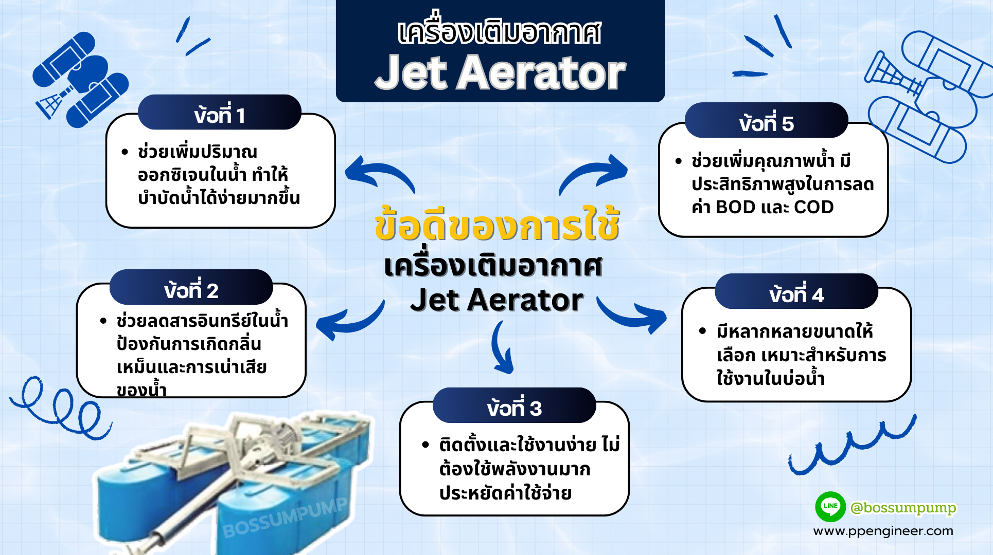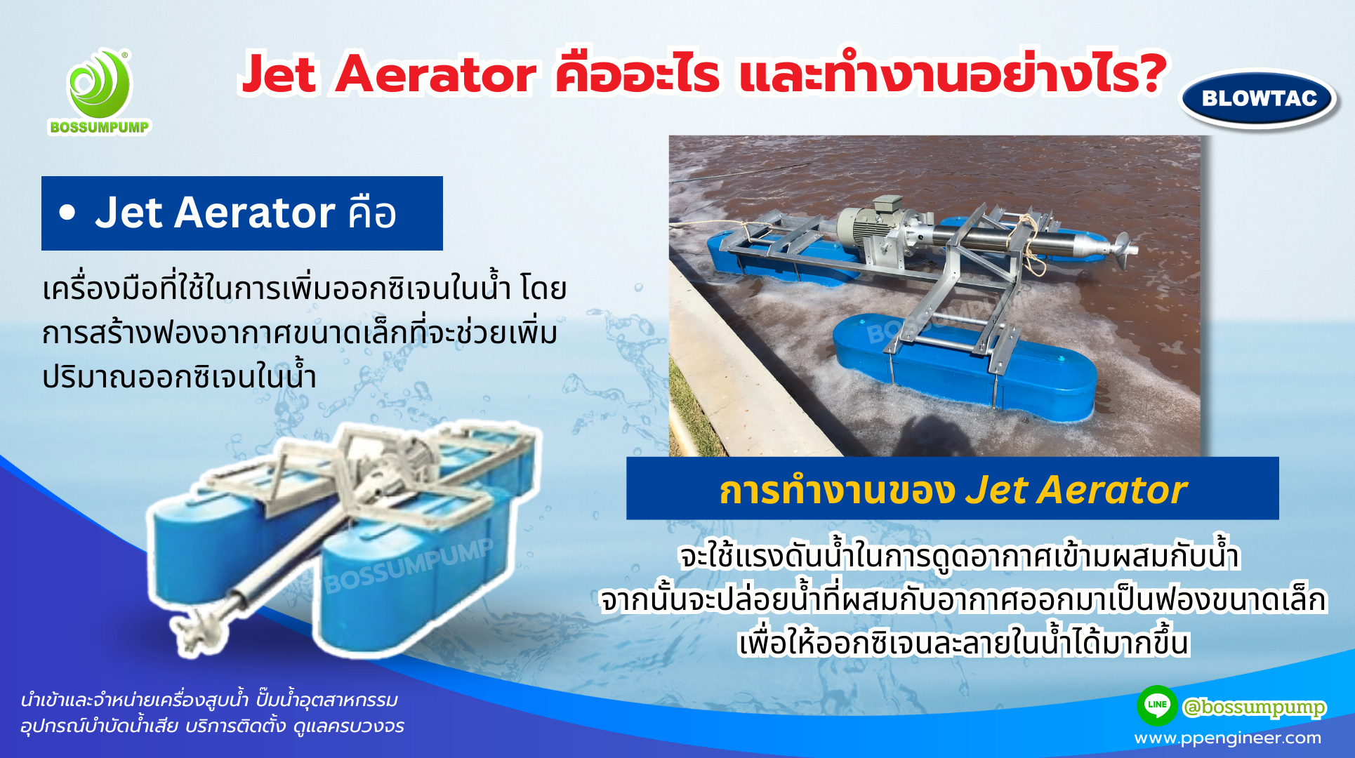 สำหรับระบบที่ต้องการการเติมอากาศแบบลึกหรือเฉพาะเจาะจง jet aerator เป็นอีกตัวเลือกที่ควรพิจารณา เครื่องชนิดนี้ทำงานโดยพ่นน้ำผสมอากาศผ่านหัวพ่นแบบเจ็ทลงไปในน้ำ วิธีนี้ช่วยให้ออกซิเจนกระจายตัวได้ดีและน้ำเสียไหลเวียนทั่วถึง
