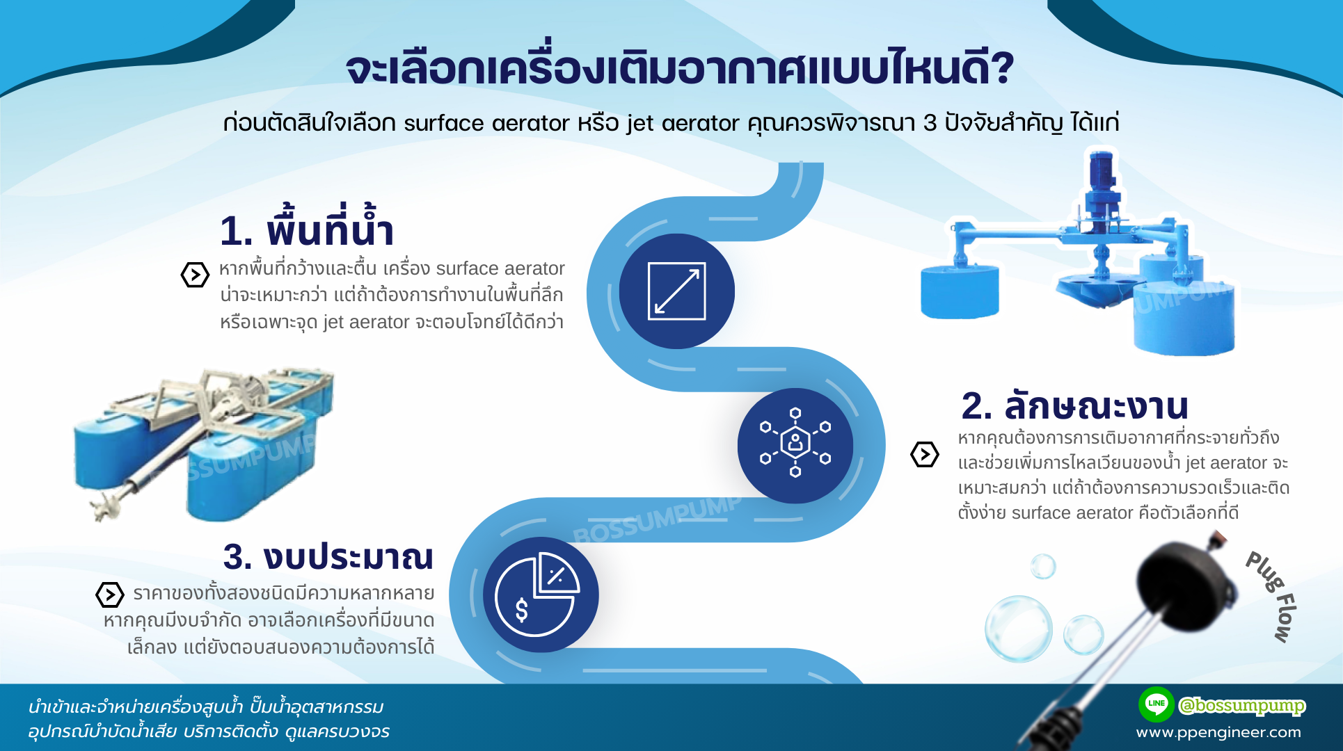 -พื้นที่น้ำ: หากพื้นที่กว้างและตื้น เครื่อง surface aerator น่าจะเหมาะกว่า แต่ถ้าต้องการทำงานในพื้นที่ลึกหรือเฉพาะจุด jet aerator จะตอบโจทย์ได้ดีกว่า