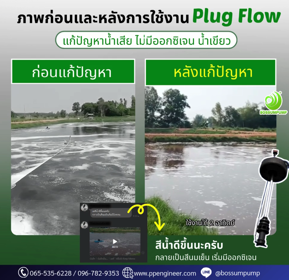 ผลลัพธ์: หลังติดตั้ง Plug Flow Aerator "สีน้ำดีขึ้น กลายเป็นสีนมเย็น เริ่มมีออกซิเจนในน้ำ"