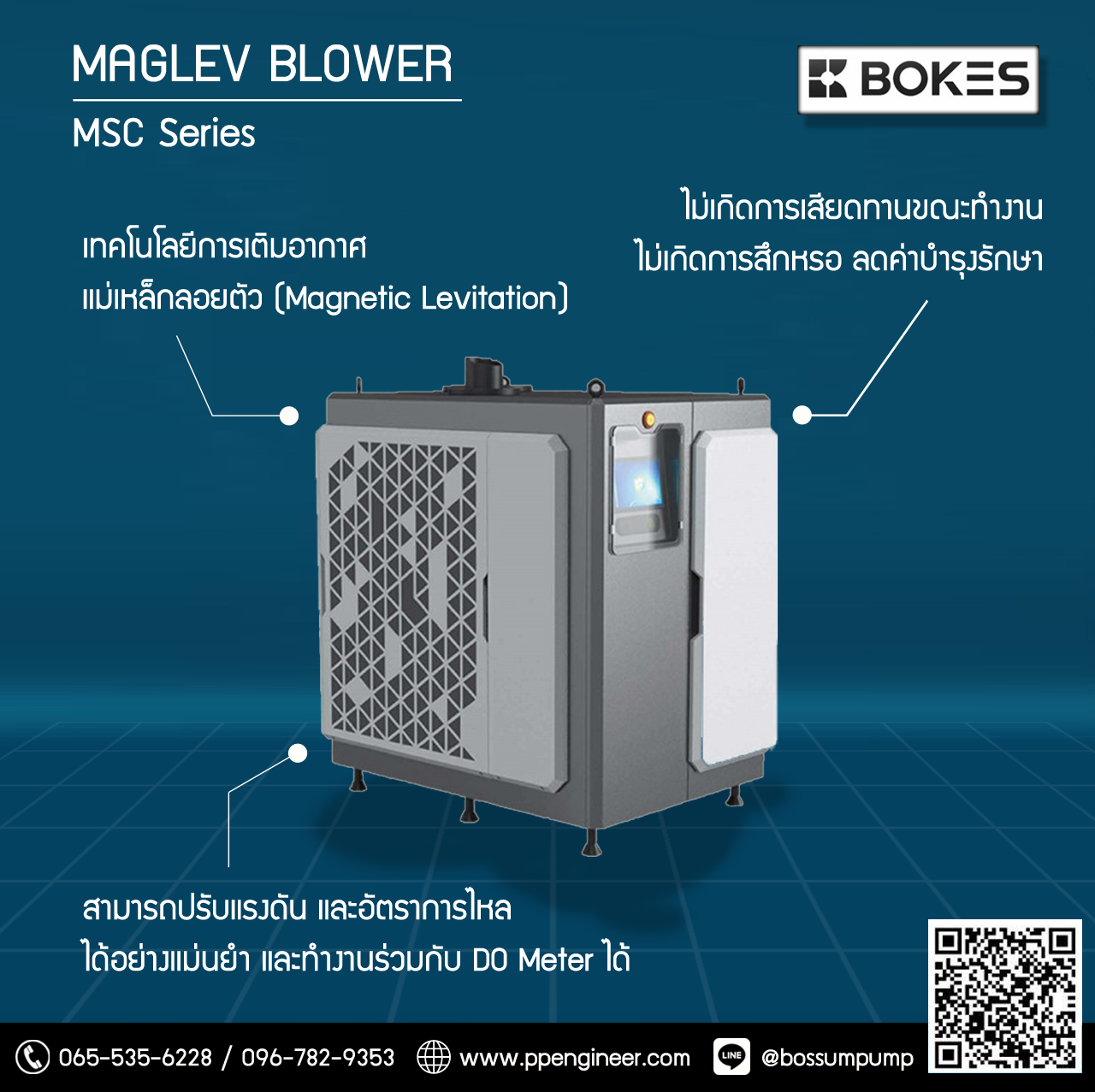 เราได้แนะนำ Maglev Turbo Blower ซึ่งใช้เทคโนโลยี Magnetic Levitation แม่เหล็กลอยตัว ลดแรงเสียดทาน ไม่ต้องใช้ลูกปืนหรือสารหล่อลื่น ทำให้ลดการสึกหรอและลดเสียงรบกวนได้มาก อายุการใช้งานนานถึง 20 ปี โดยไม่ต้องมีการบำรุงรักษาใด ๆ