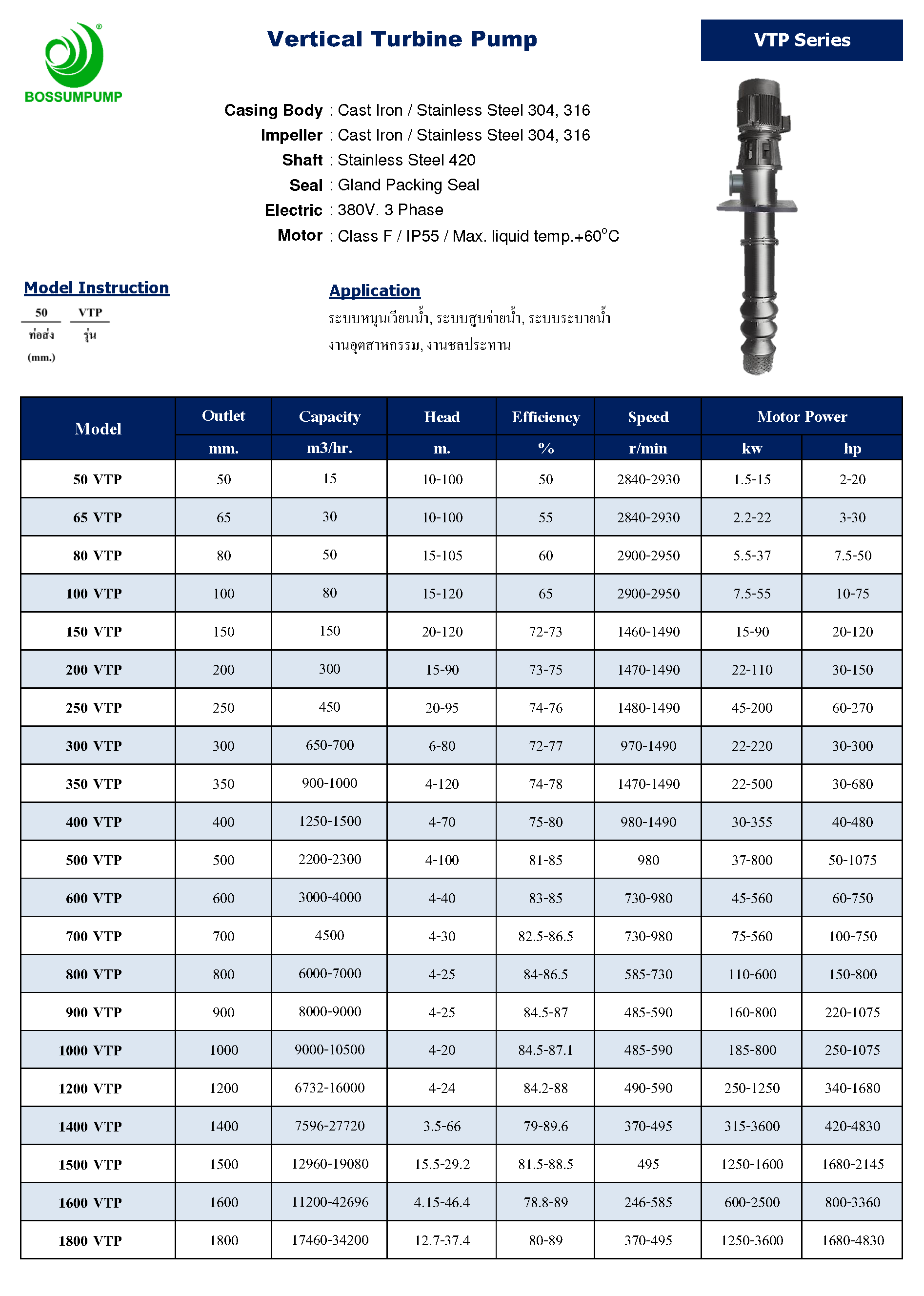 ปั๊มสูบน้ำแนวตั้ง แรงดันสูง ลักษณะการทำงานส่งน้ำได้ไกล ทนต่อตะกอนที่ปะปนมาในน้ำ ใช้กับได้ทุกประเภท Vertical Tuebine Pump นั้นต้องทำการติดตั้งบนสถานี ดารเลือกใช้ปั๊มต้องมีการออกแบบสถานี และความสูงของน้ำเพื่อจะออกแบบและผลิตปั๊มได้ ต้องมีการคำณวนท่อให้เหมาะกับการใช้งาน ปั๊มชนิดนี้ทนทานสูงนินมใช้ในนิคม โรงงาน แพลนท์ผลิตน้ำ ต่างๆ ด้วยคุณสมบัติที่ส่งได้ไกล สูบน้ำได้ลึกตามความต้องการ สามารถผลิตได้ตามที่ออกแบบ ติดต่อสอบถามการออกแบบติดตั้งก่อนพิจารณาสั้งซื้อเพื่อจะได้สินค้าและบริการที่ดีที่สุด